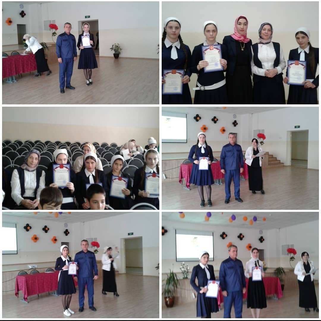 22.05.2019На церемонии награждения победителей муниципального этапа олимпиады школьников. В этом году у нас много достижений.Джукалаева Карина (8-Б класс) - I место по чеченскому языку;Астемирова Залина (7-Б класс) - II место по чеченскому языку;Исламова Асет (6-А класс) - III место по чеченскому языку;Дубаева Залина (8-Б класс) - II место по русскому языку;Дубаева Селима (3-А класс) - III место по окружающему миру.Также, ученица 9-А класса Мутаева Раяна заняла почетное II место в конкурсе сочинений "Ненан мотт - сан дозалла".Молодцы, ребята, поздравляем!Поздравляем также учителей, подготовивших детей к олимпиаде.Спасибо за Ваш труд.