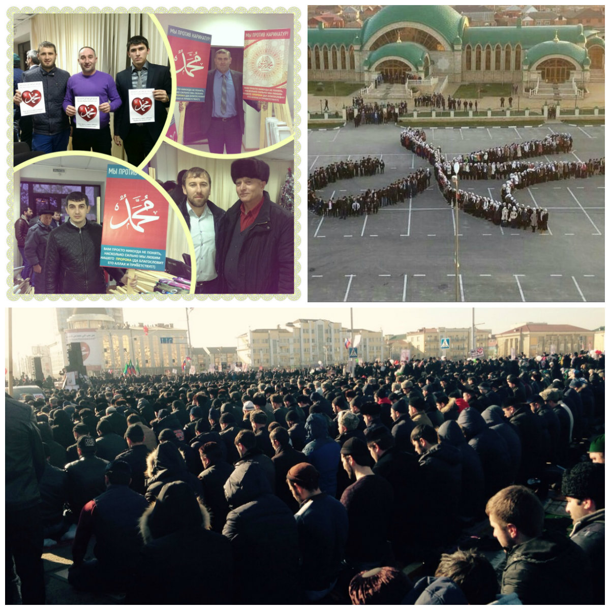 Несколько сотен тысяч человек приняли участие в акции протеста в связи с публикациями западными СМИ материалов, преследующих цель оскорбить Пророка Мухаммада (да благословит его Аллах и приветствует). Также прибыли в Грозный для участия в манифестации известные религиозные деятели из других регионов страны. Инициатором проведения акции выступило духовенство республики, которое выразило осуждение любым формам террора. При этом представители духовенства выражают мнения, что случившееся является провокацией, преследующей цель поднять новую волну антиисламских выступлений. Они также порицают любые действия, прямо или косвенно оскорбляющие Посланника Аллаха (мир ему).