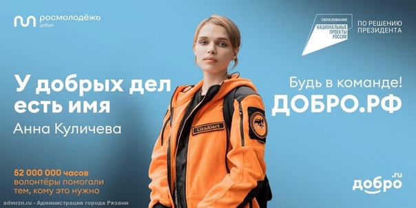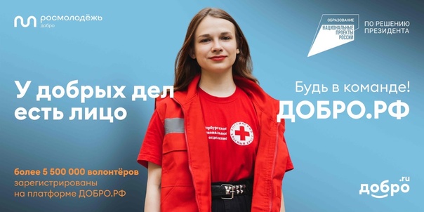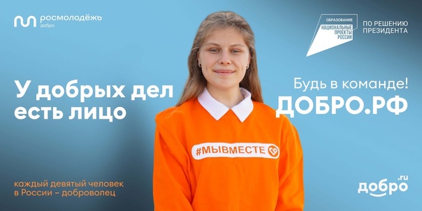 24.11.2023В преддверии Дня добровольца стартовала акция «У добрых дел есть имя». Она проводится с 4 ноября по 10 декабря 2023 года в рамках реализации мероприятий федерального проекта «Социальная активность» национального проекта «Образование» и направлена на популяризацию добровольческой (волонтерской) деятельности в Российской Федерации.Концепция кампании «У добрых дел есть имя» построена на реальных делах неравнодушных россиян, людях, для которых волонтерство – стиль жизни. За каждым поступком всегда стоит неравнодушный человек, который своим примером вдохновляет других. Реальная помощь и добрые дела не могут и не должны быть безликими. Поэтому в рамках акции размещаются баннеры, транслируются видео- и аудиоролики на ТВ-каналах и в соцсетях. В каждом макете размещена фотография волонтера, указаны его фамилия и имя, макет дополняется фактом об оказанной помощи через платформу Добро.ру.Добро.ру – крупнейшая платформа для добрых дел. Здесь собраны и систематизированы тысячи проектов из всех регионов России и зарегистрированы миллионы волонтеров. С помощью платформы можно стать добровольцем, совершенствоваться, создавать и продвигать собственные инициативы.Акция «У добрых дел есть имя» также предваряет проведение Международного форума гражданского участия «МЫВМЕСТЕ», который пройдет с 4 по 8 декабря в Москве.