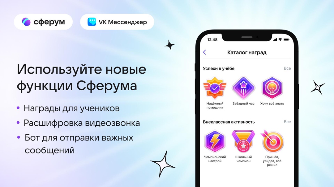 16.01.2024Благодаря разделу «Награды» учителя смогут мотивировать и поощрять школьников за достижения в учебе, спорте и внеучебной деятельности с помощью специальных наград.Пользователям учебного профиля Сферум в VK Мессенджере стала доступна расшифровка видеозвонков, с помощью которой можно оперативно получать текстовые расшифровки педагогических совещаний или родительских собраний. В последнюю версию разработчики также добавили функцию важных сообщений — она поможет не пропустить в учебной переписке нужную и актуальную информацию.