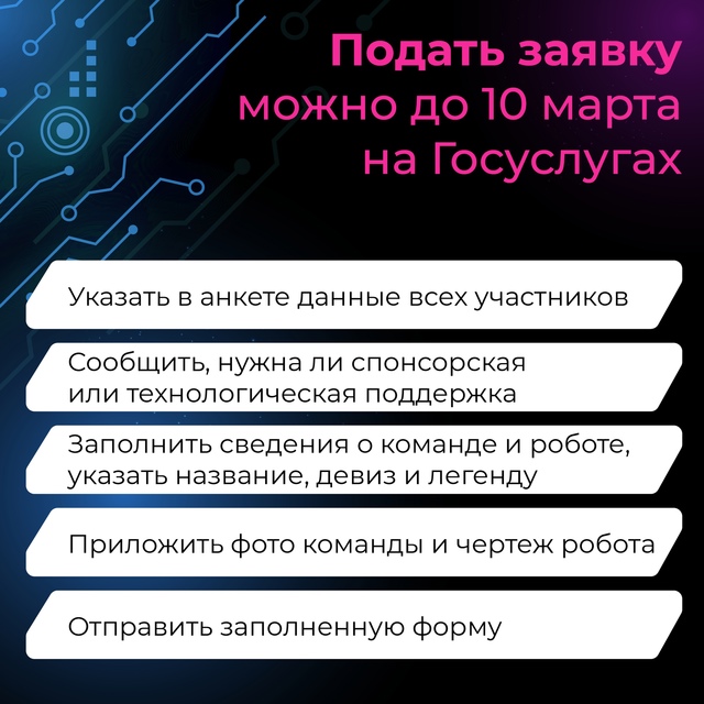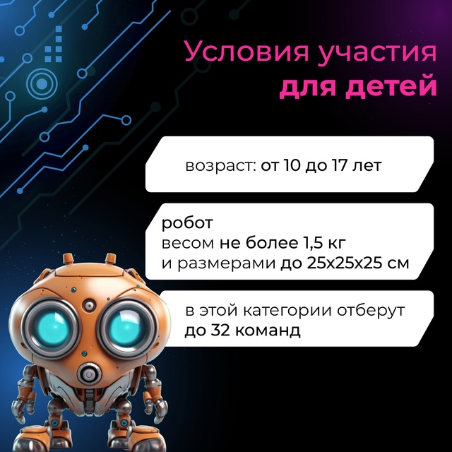 06.03.2024Это не только зрелищный чемпионат, но и международная площадка обмена опытом в робототехнике.Твоя задача: сконструировать робота в соответствии с требованиями категории, ведь от него зависит твоя победа. После этого управляй им и демонстрируй свои технические навыки в поединках!В каждой команде могут участвовать от 1 до 5 человек. Не упусти свой шанс – подавай заявку до 10 марта.Зарегистрируйся сейчас и узнай все детали по ссылке https://clck.ru/39ERUQ